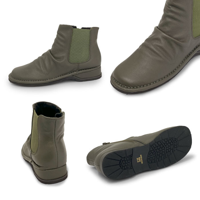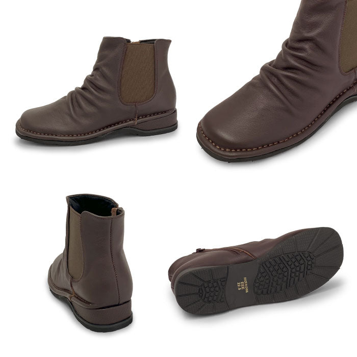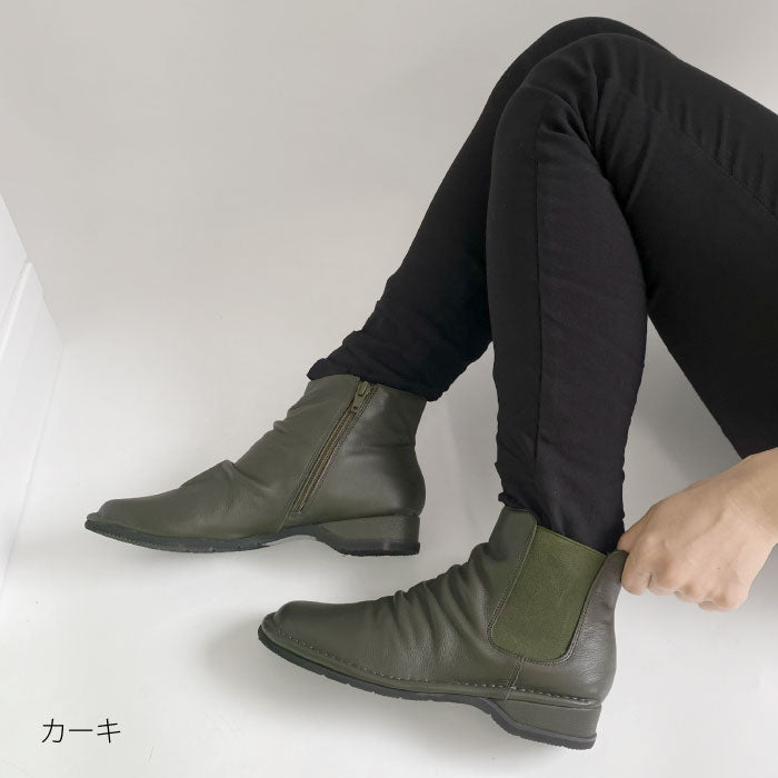 くしゅっとやわらかみのあるシャーリングデザインが人気のレザーブーツにサイドゴアデザインが登場しました。幅広3Eですがすっきりしたシルエットなので、足元がきれいに見えます。アウトソールも防滑加工があり安心です。