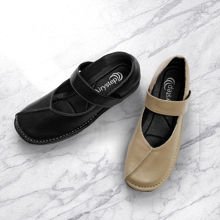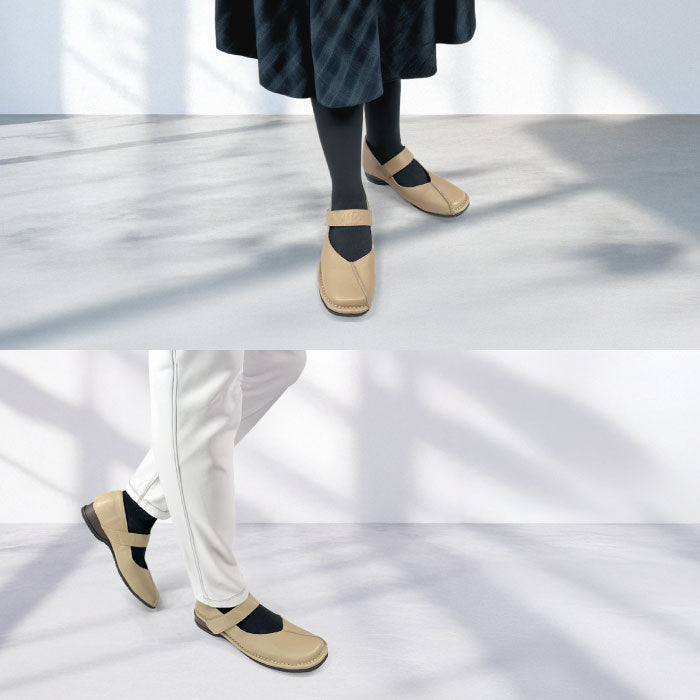 ワンストラップで甲部分をしっかり包み込む、脱げにくく足に優しいコンフォートシューズ。フラットソールなので歩きやすく安定した履き心地です。アッパー部分の切り替えと甲部分の抜け感が足元をすっきりと見せてくれるシューズです。