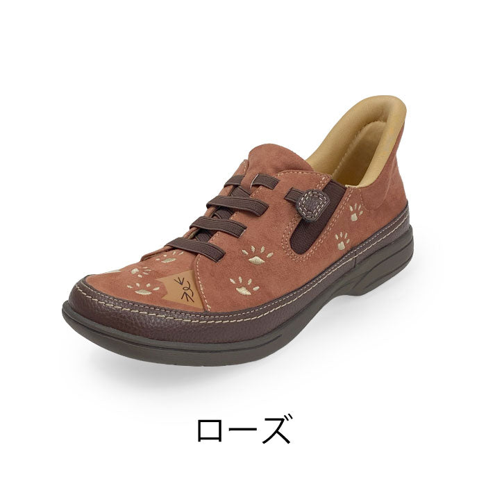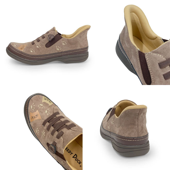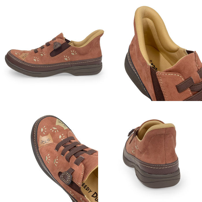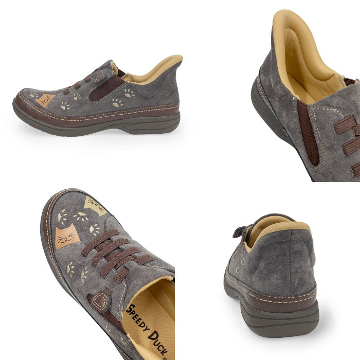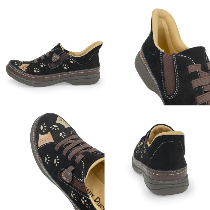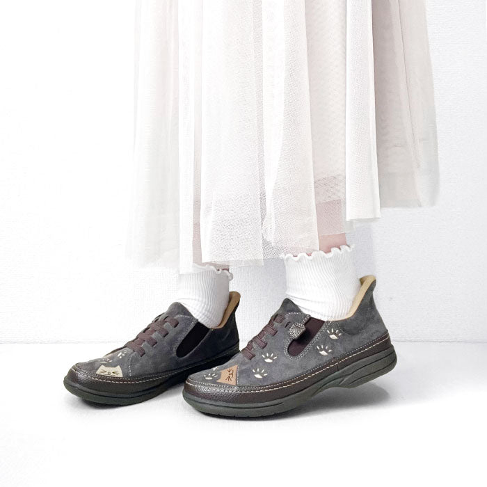 猫・ネコ・ねこ!!猫好きさん待望のにゃんこスリッポンシューズ。 レースアップはゴム紐で、サイドゴムもあり脱ぎ履きが楽ちん。さらにかかとはつぶさず履ける仕様になっているので両手に荷物を持ったままでも足入れがスムーズです◎