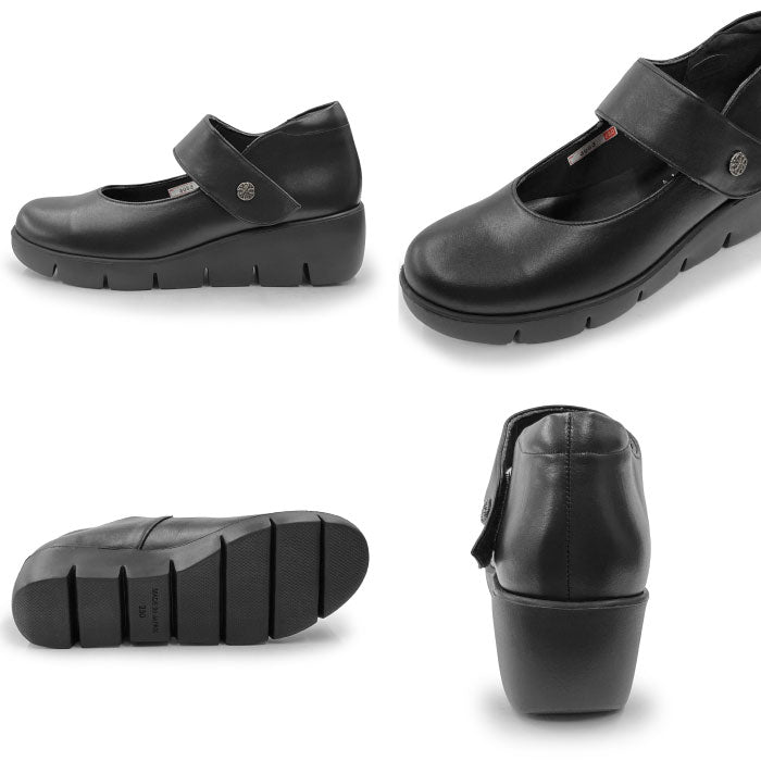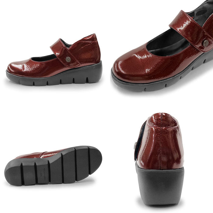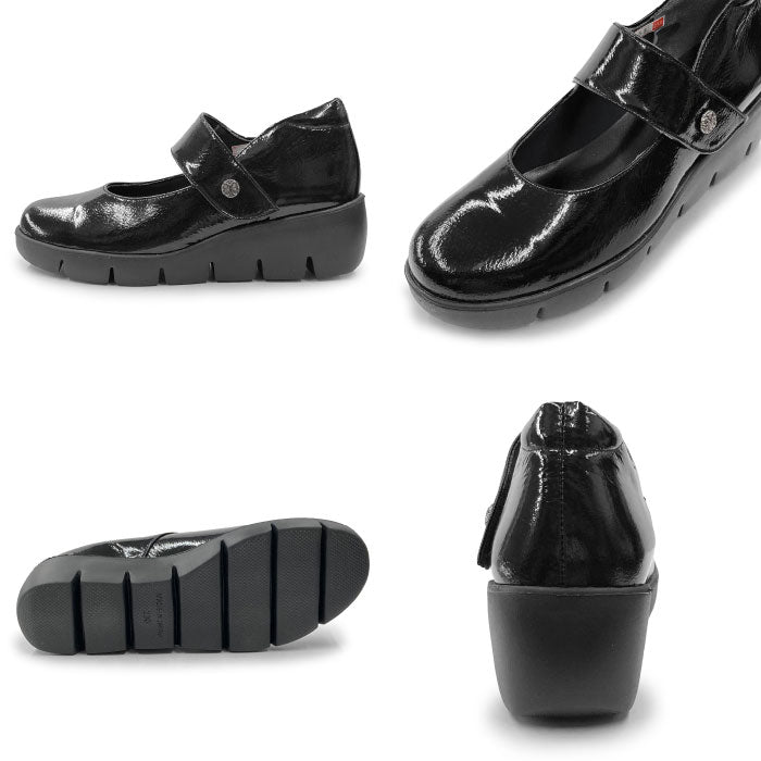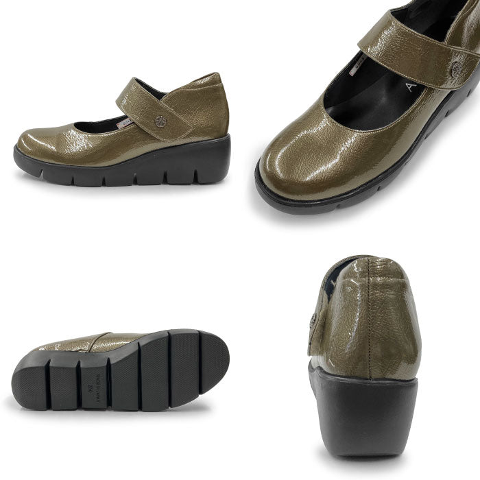 Airystepの厚底レザーシューズ。トレンド感のあるボリュームシルエットが可愛いアイテム。厚底で歩きやすく、マジックテープで脱ぎ履きが簡単。太めの甲ベルトなので、足にフィットして脱げにくく安定した履き心地で◎。ツヤのあるエナメル素材は、カジュアルすぎず色々な場面で使えます。