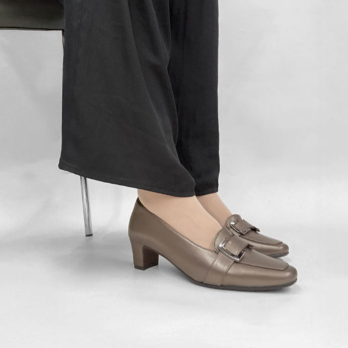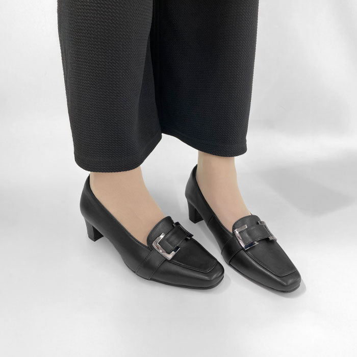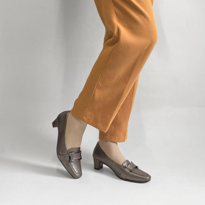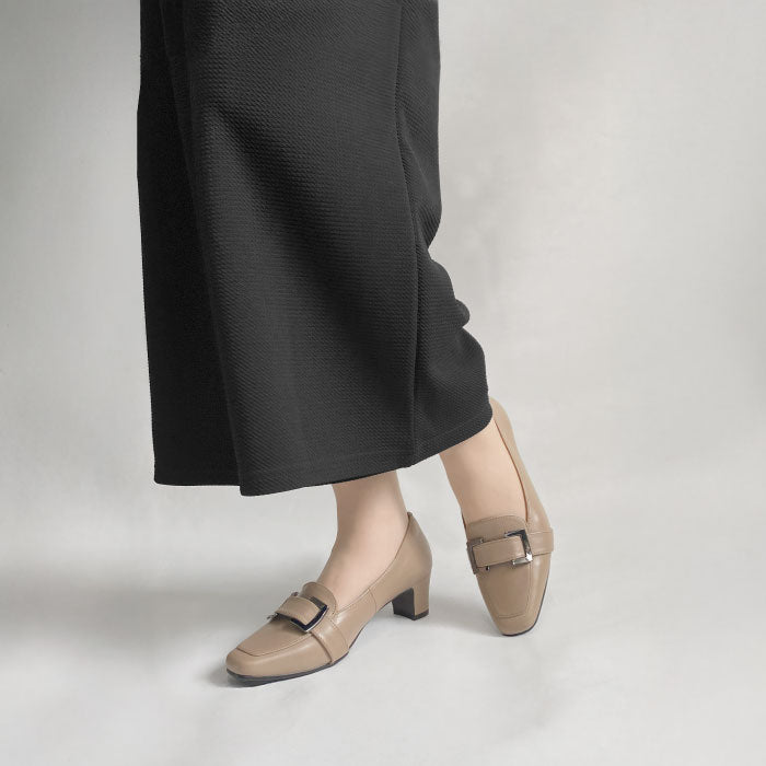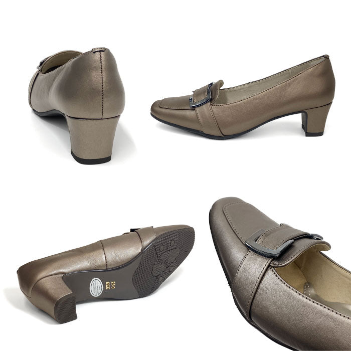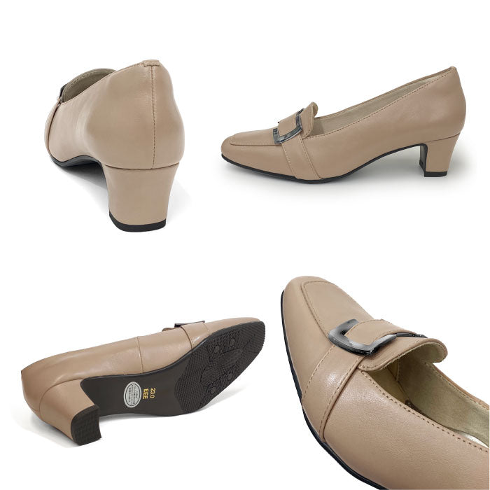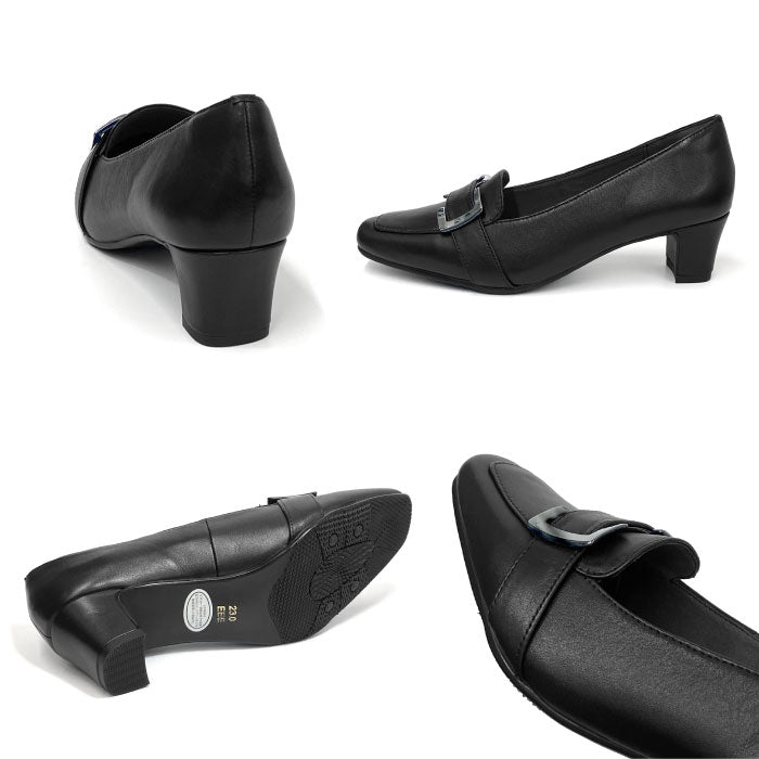 洗練されたシャープなバックルが大人の佇まいを美しく仕上げてくれます。上品な印象のキューバンヒールも4.5cmで使いやすく、屈曲性のよいソールと低反発クッションが足の負担を軽減してくれます。またアウトソールは防滑仕様となっており、デザイン性と機能性を兼ね備えた一足です。