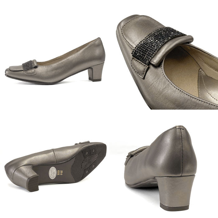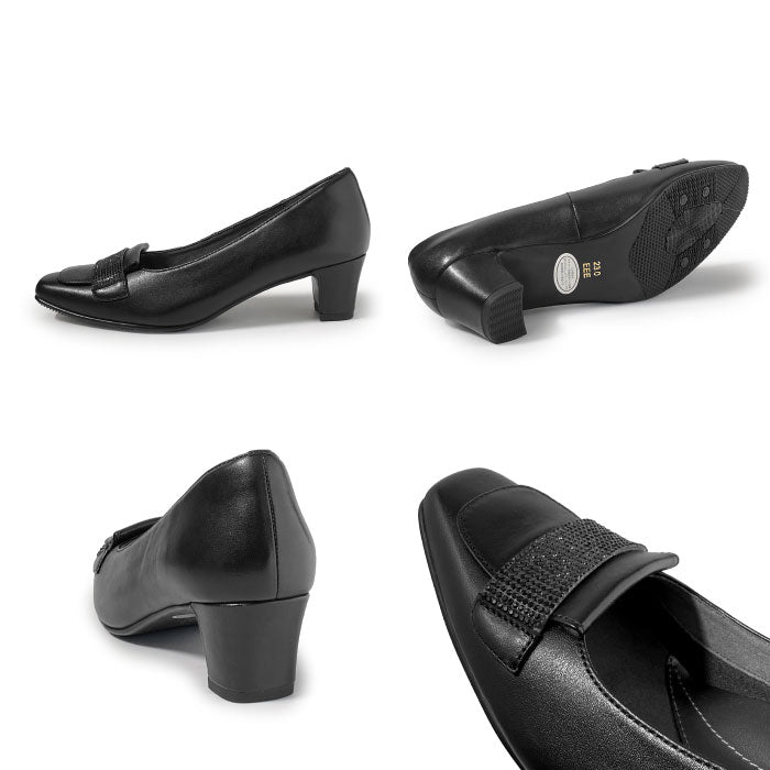 品よく光るラインストーンベルトがアクセントの大人パンプス。程よい高さなのでヒールが苦手な方でも安定感のある履き心地。アウトソールは滑りにくい素材を使用しているので、滑りやすい床でも安心です。