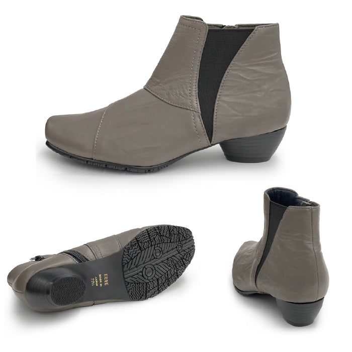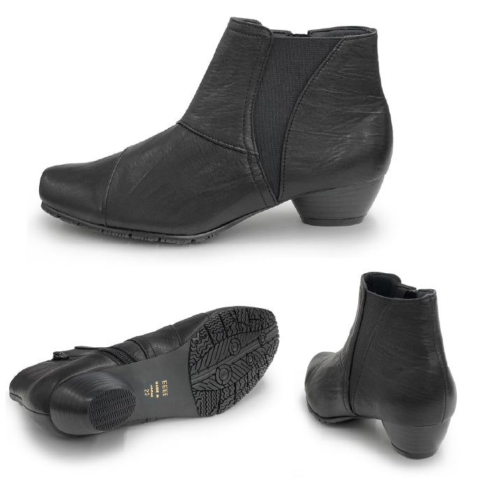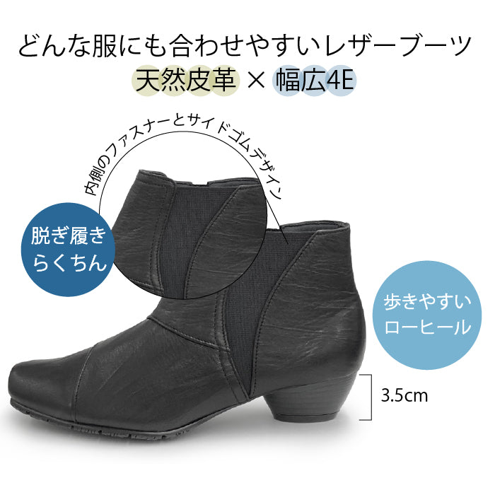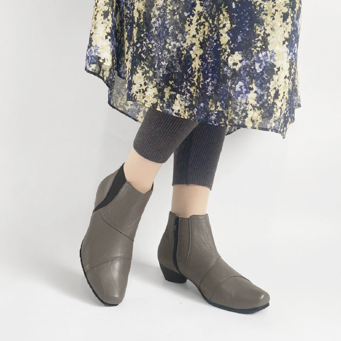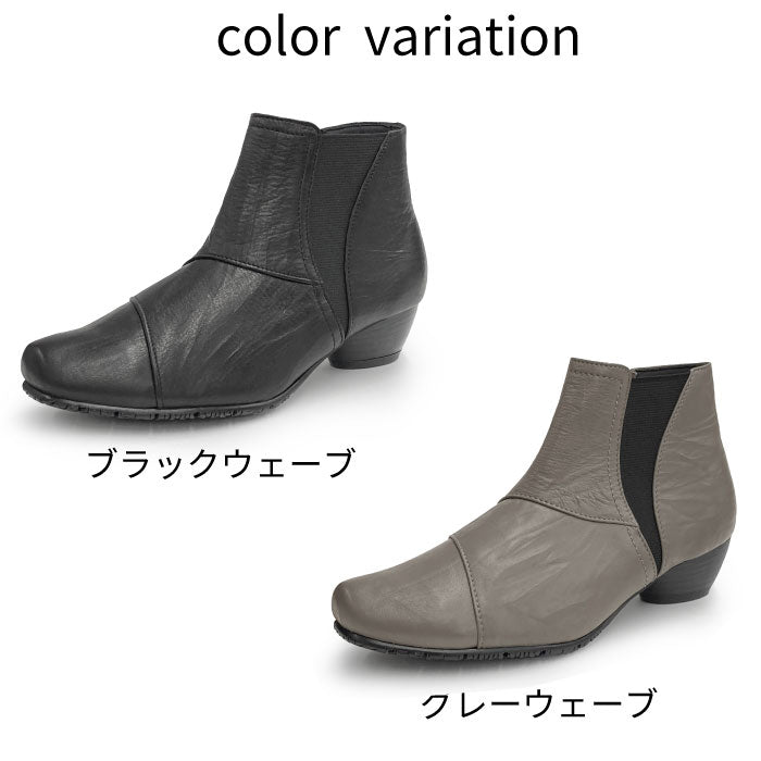 シワ加工されたレザー がオシャレなユキコキミジマの人気ブーツです。内側のファスナーとサイドゴムデザインだから脱ぎ履きするのも簡単です。安定感のあるローヒールなので歩きやすく疲れにくいです。