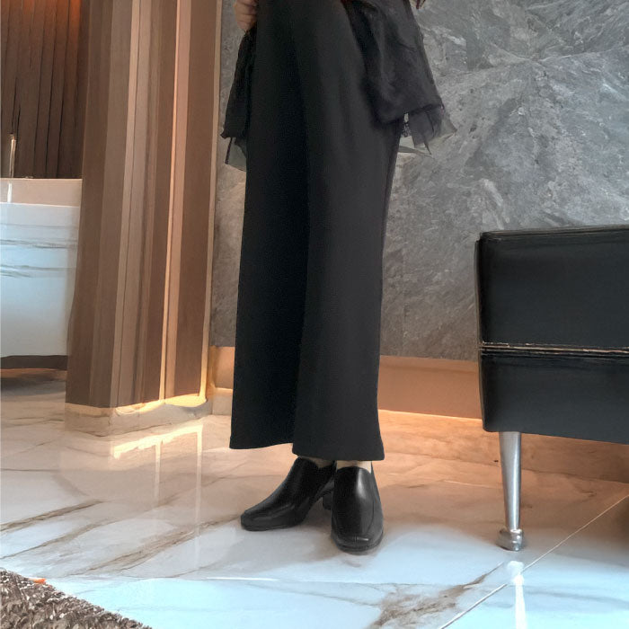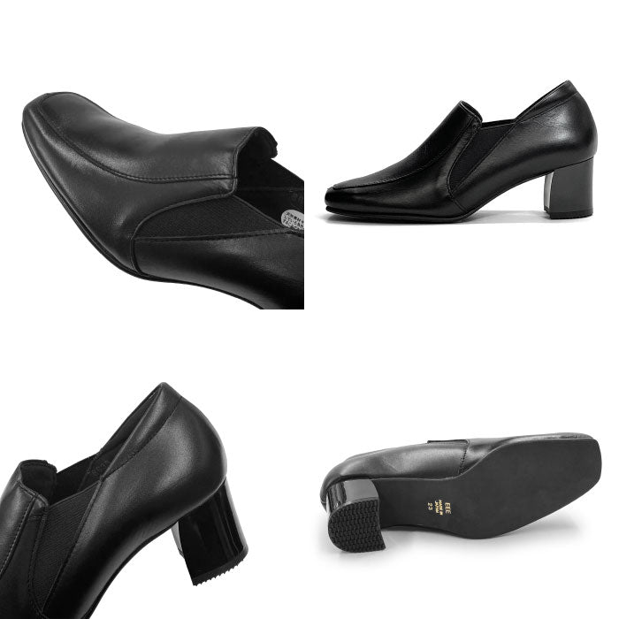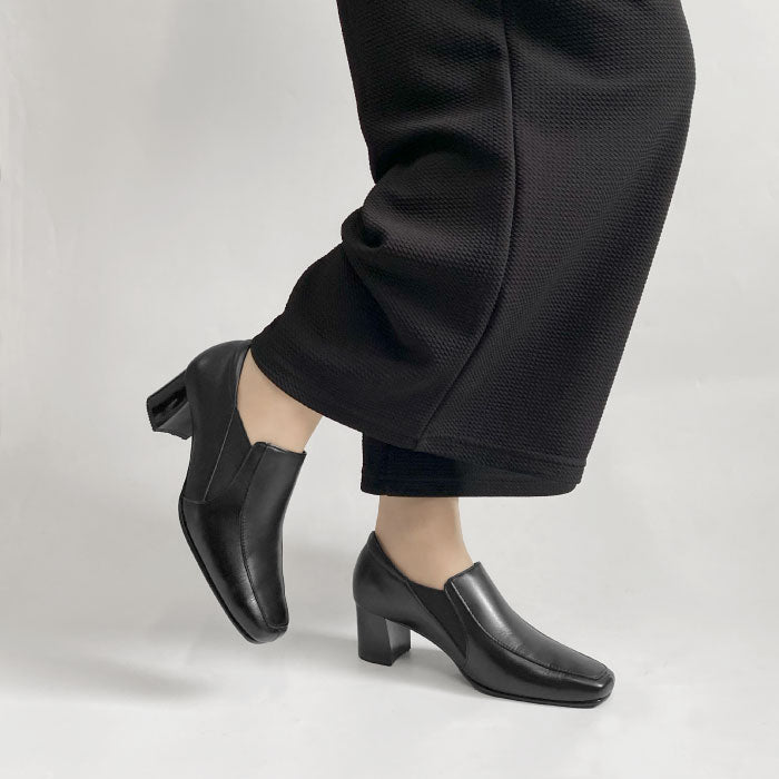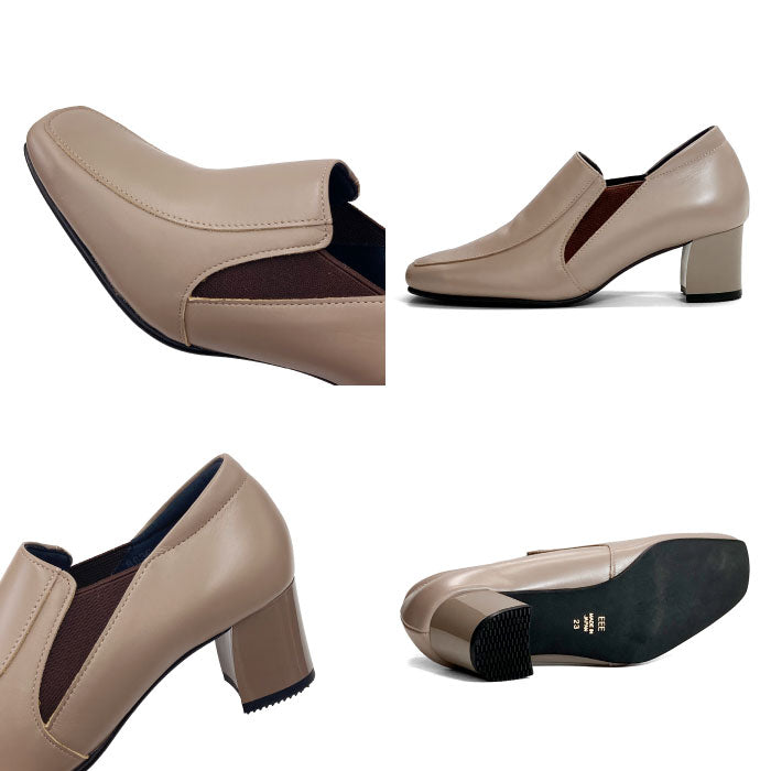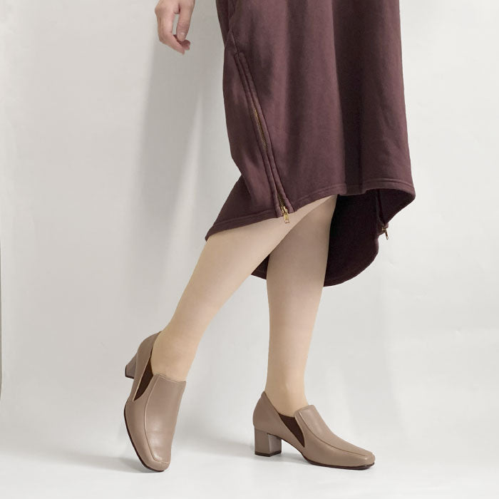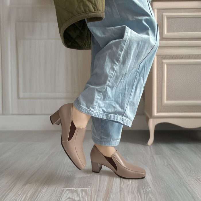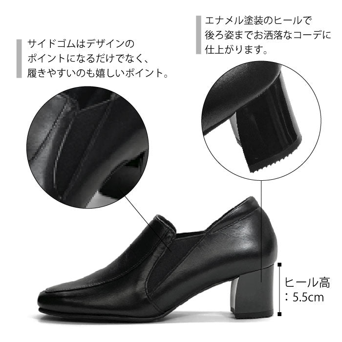 エナメル塗装のヒールで後ろ姿までお洒落なコーデに仕上がります。サイドゴムはデザインのポイントになるだけでなく、履きやすいのも嬉しいポイント。甲の深さとスクエアトゥによって程よいモード感を取り入れた1足。細部までこだわった、オールシーズン活躍するアイテムです。