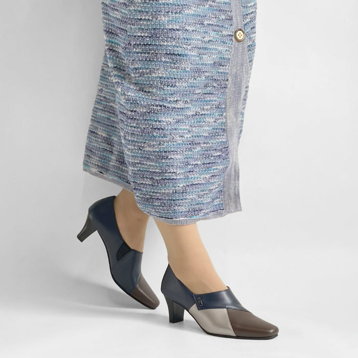秋冬カラーの配色がおしゃれなブーティパンプス。落ち着いたトーンカラーなのでスタイリングしやすく挑戦しやすいカラーリングです。足首回りがすっきりする深めのデザインで細見えするのもうれしい1足。