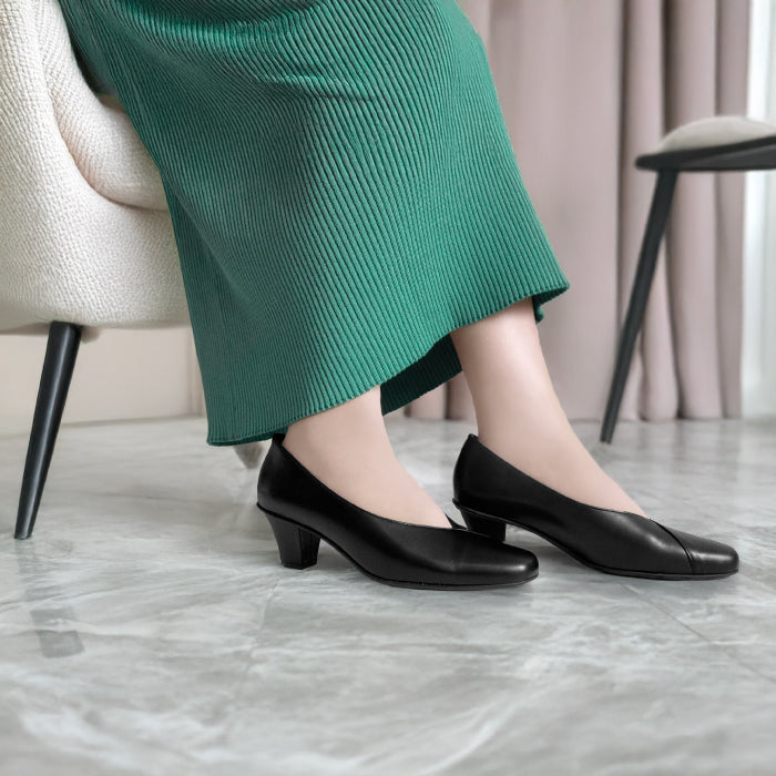 シンプルなデザインだからこそ際立つレザーの質感の素晴らしさ。日本の職人が丹精を込めて作り上げたユキコキミジマの新作デザインです。履き口のVカットが足を美しく見せるポイント。柔らかいソールと低反発クッションが快適な履き心地を与えてくれます。