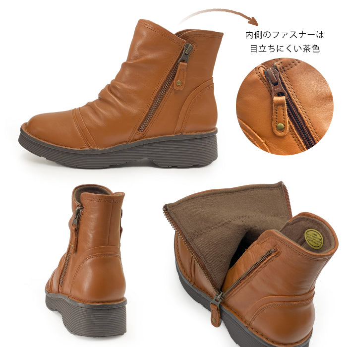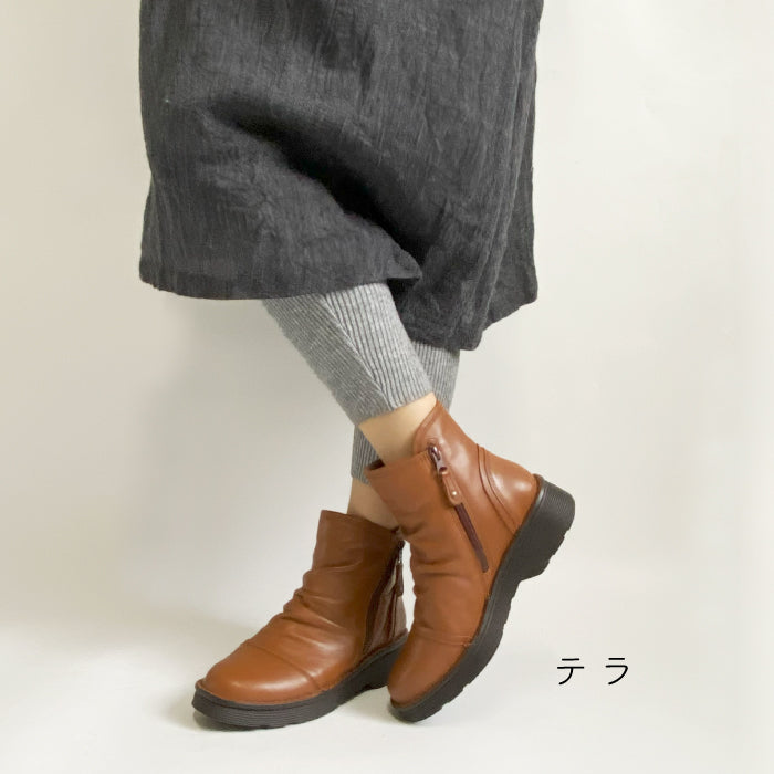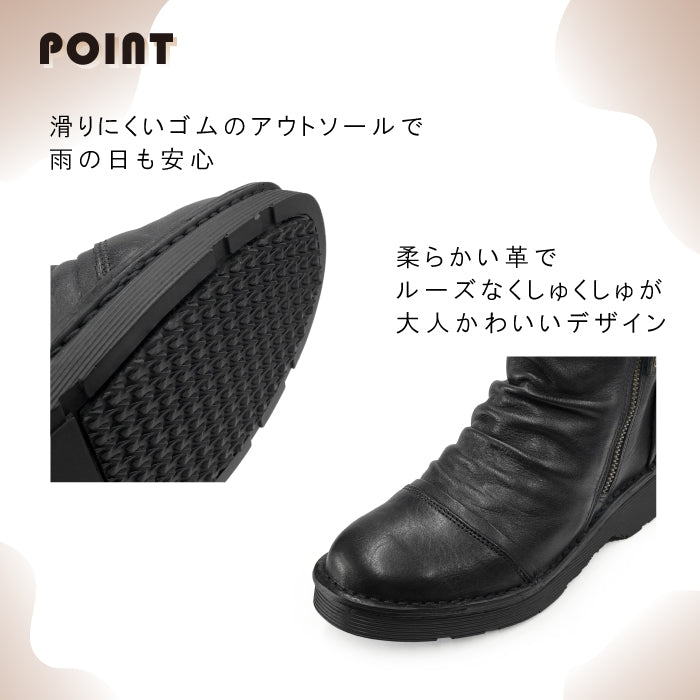 可愛すぎない大人のカジュアルブーツ。くしゅくしゅっとしたルーズな見た目のショート丈のブーツは幅広いスタイルに合わせやすいアイテムです。筒まわりも柔らかく、足入れするときのストレスもありません。