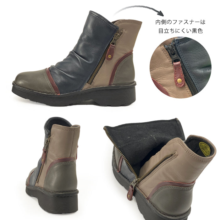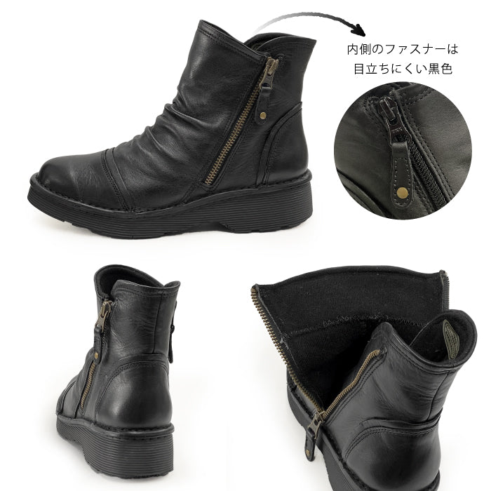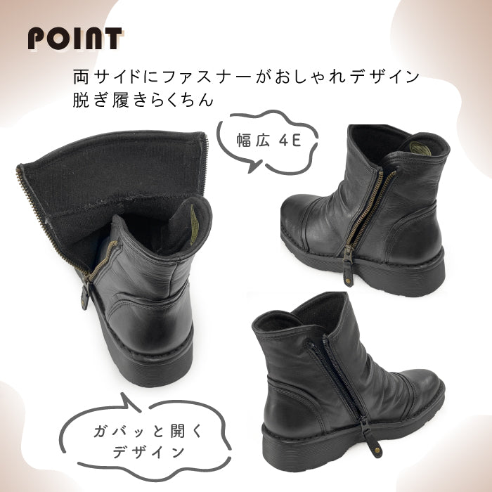 なんといっても外側と内側の両サイドにあるファスナーがあるので履きやすい!また、フラットソールなので、安定性があり足への負担が少なく歩きやすい1足です。