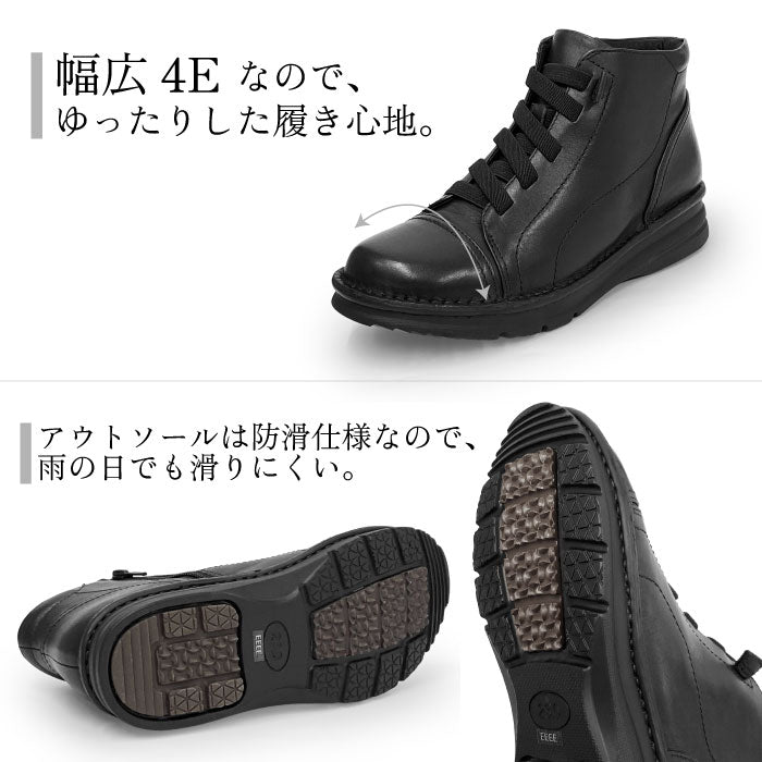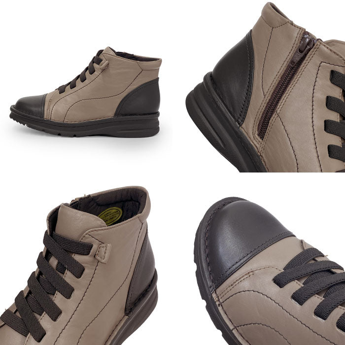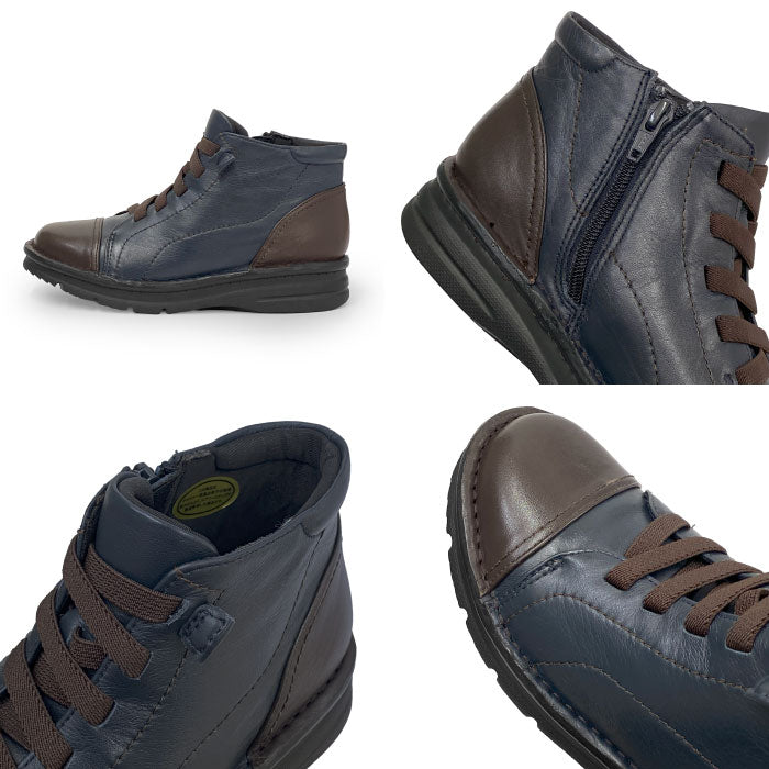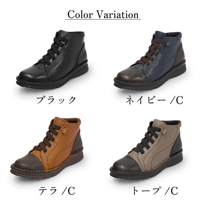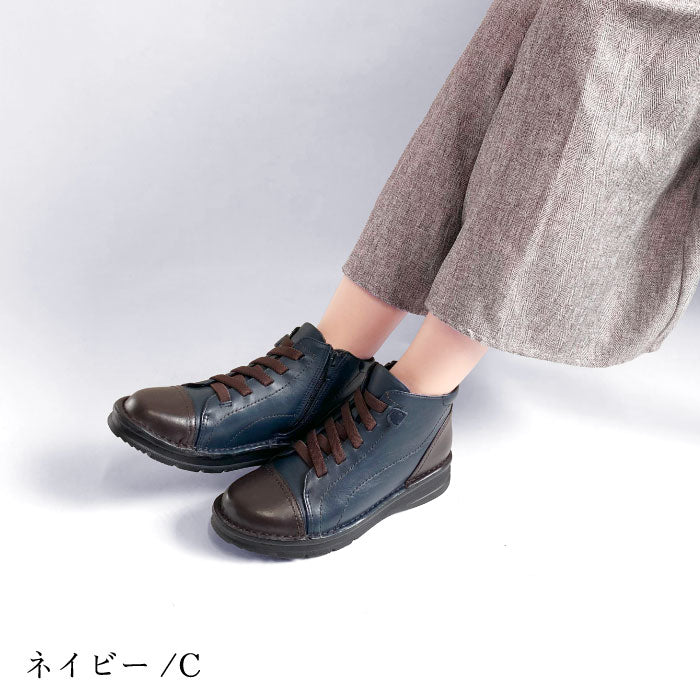 バイカラーのオシャレでスポーティーなレザーブーツ。レザーの質感が良く見た目も高級感に溢れています。ボリューム感のあるソールなので歩きやすく幅広4Eなのも嬉しいポイントです。パンツスタイルと合わせてカジュアルに仕上げるのがオススメです。
