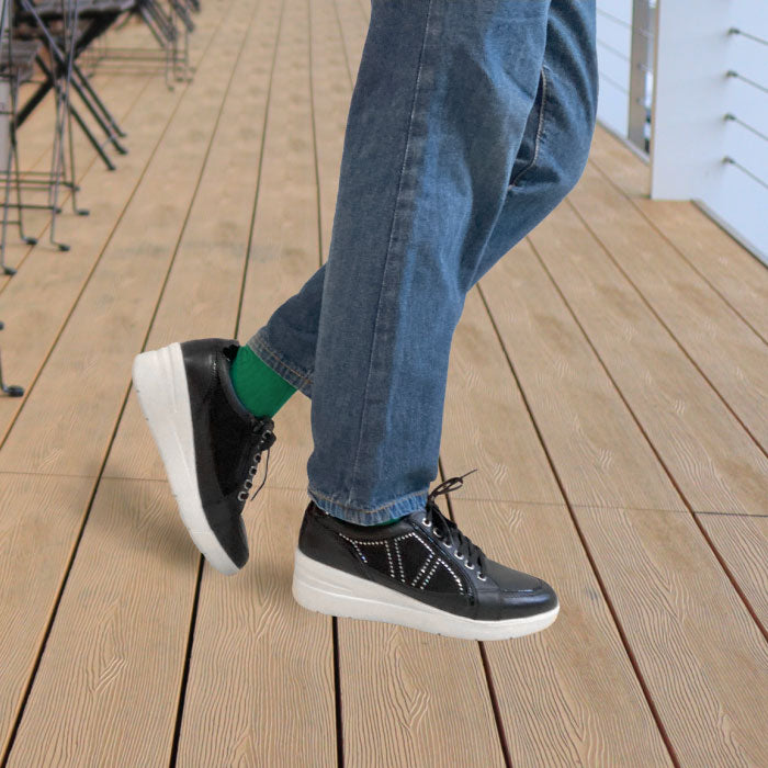 キラリと光るラインストーンが特徴的なスニーカーが新作登場!小粒ストーンで派手に見えすぎないのがGOOD。スニーカーで大人コーデにハマるフォルムは意外と少ないので、スニーカーは履きたいけど...と、お探しの方にオススメ。カジュアル過ぎないシルエットの美しいスニーカーです。着脱しやすいファスナー仕様もポイント。