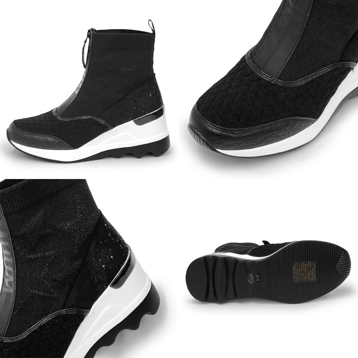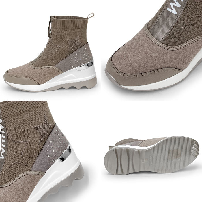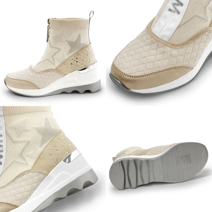 7.0cmのウエッジソールでスタイルアップ出来るMUUMロゴがアクセントのソックスブーツ。スター柄を施したニットデザインに、かかとには散りばめられたラインストーンが輝く。つま先アッパーはラメ入りのキルティング素材がかわいい(ブラック、ベージュのみ)。スポーティなデザインながらカジュアルさとエレガントさが演出されます。