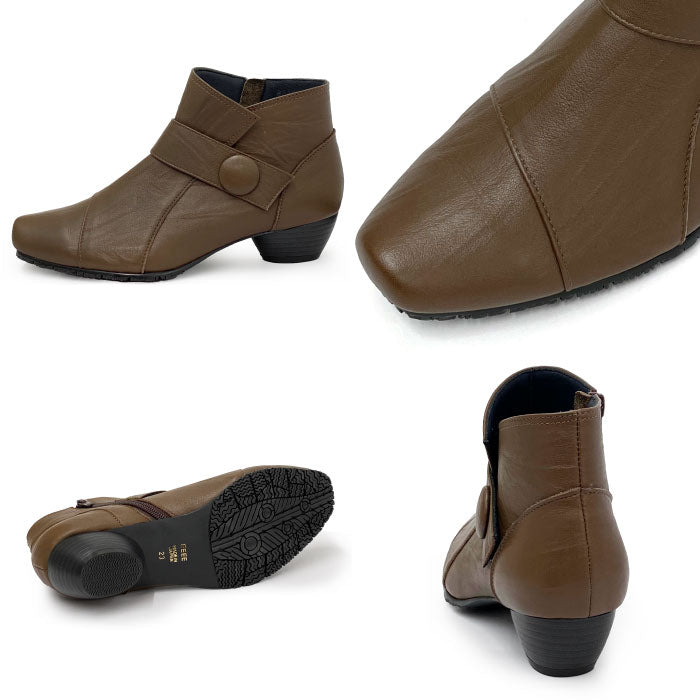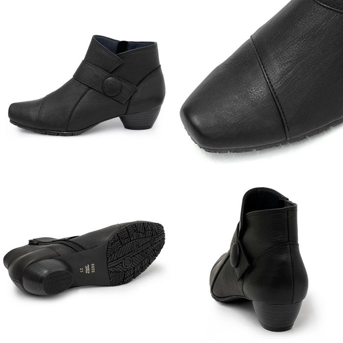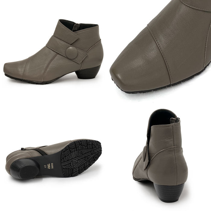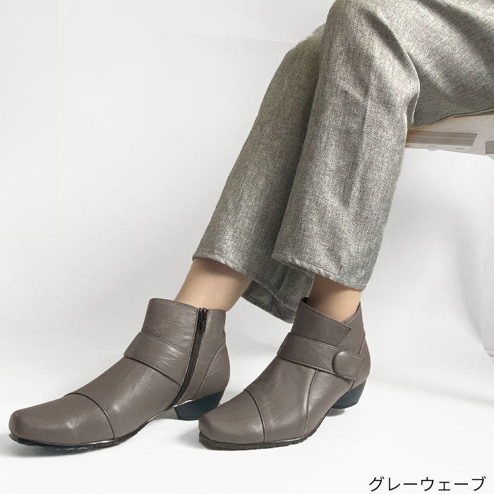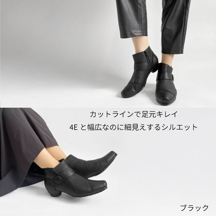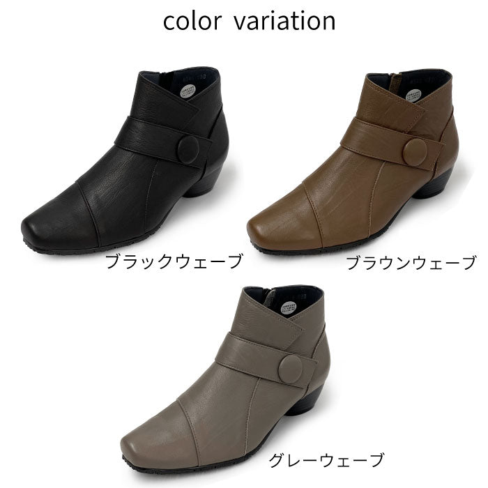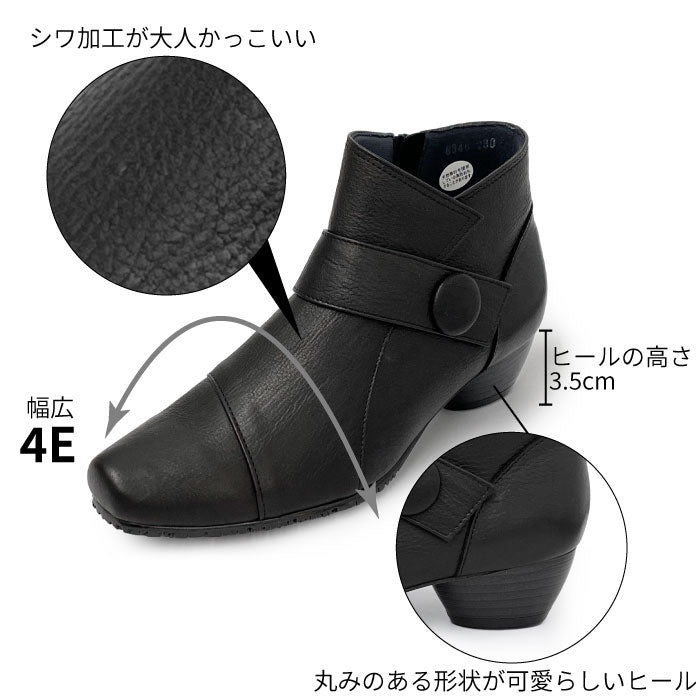 Yukiko Kimijimaのシワ加工されたレザーが特徴のシリーズに人気のくるみボタンデザインが新登場。丸みのある形状が可愛らしいヒールは程よい高さで歩きやすく、とても柔らかい革を使用し、その革で足首を包みこむようなカットラインが足元をスッキリと美しく見せます。ワイズ4Eでゆったりとした履き心地ですが細見えするデザインも嬉しいポイントです。大人カワイイの演出にぴったりな1足です。